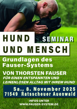 Am 8. November 2025 findet in Unterbrüden (Auenwald) das Seminar "Hund und Mensch" von Thorsten Fauser statt.